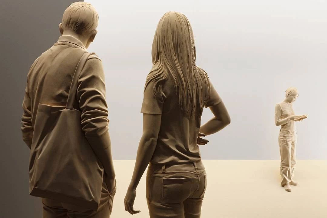 艺术家Peter Demetz的雕塑作品善于定格平凡而亲切的时刻,并传达了一种强烈的求知意识。他装置超越了日常生活的框架,捕捉了人物的简单手势和独特姿势,这些人物形象通常是高个子、秃顶且阳刚的男人。他的人物作品都经过精心设计,突显其日常状态,使观察者可以专注于人物的本质或灵魂。